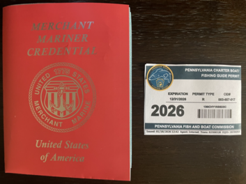 I carry a PA Guide Permit, (yellow/blue) which is required to run for hire on the Susquehanna River. Additionally NOT required, I also have my federally issued USCG MMC Captains License. (RED) Making me a permitted PA guide and USCG Licensed Captain. There are very few true Captains on the Susquehanna RIver since there's a lot that goes into becoming a Captain and it is not a requirement. I put my certification to use working in VA and it just makes me overqualified to take your family out here. Not a bad thing!